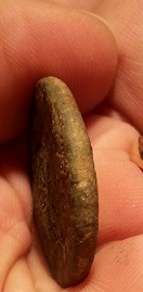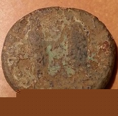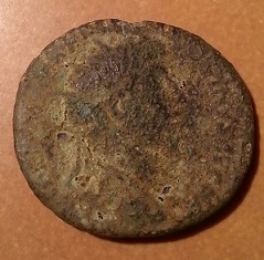 Après deux heures de marche sans trouvailles et au moment de rentrer, je tombe sur cette monnaie romaine. Elle mesure de 2.5cm et 2.2cm dans l'autre sens ( elle est un peu ovale..). Épaisse de 2mm au plus large et de 1mm au moins large.