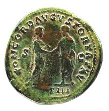 L'avers affiche une tête à droite. Je crois distinguer trois 'piques' sur la chevelure et un bandeau qui pend à l'arrière de la tête. Je distingue très mal quelques lettres : ...D I V I N Y... Je crois... Il y beaucoup de lettre tout autour et sur les deux faces.