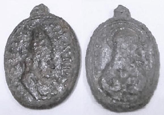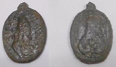 Sur l'autre face, la vierge auréolée aux bras croisés sur la poitrine il me semble. Aucune inscription.