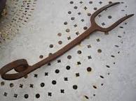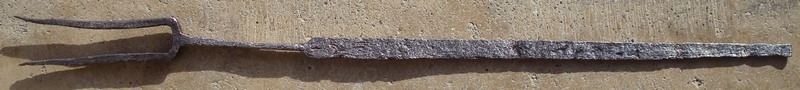 elle semble faite de façon très artisanale par le forgeron local, elle était pendue dans l'atre a coté du foyer