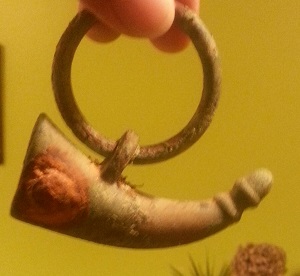 Dans un prés en bordure de forêt j'ai sorti cet objet bizarre. On dirais une corne... Ca me fais penser aussi un à un 'poudrier'. Ca mesure 7cm de long. Le diamètre de l'anneau est de 4.5cm. Pas de poids désolé... Au niveau de l'orifice, de chaque côté, il y a deux 'points de rouille' qui indiquent l'emplacement de deux trous...