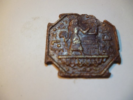 Petite plaque ou élément de broche souvenir d'Egypte, le thème de l'Egypte antique était très à la mode au XIXe et début du XXe siècle. Quand au motif, on reconnait à droite, un peu usée, la figure du dieu-crocodile Sobek, dieu de la fertilité et du Nil dans le panthéon égyptien. Peut-être la copie d'un extrait du Livre des Mort... les hiéroglyphes me semblent un peu fantaisistes, mais peut-être est-ce dû juste à l'usure.
