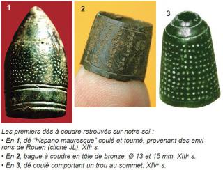 Après recherches, les dés possédant une ouverture au haut étaient utilisés pour coudre le cuir ou la peau par les bourreliers, ou encore par les tailleurs pour les tissus épais. C'étaient des dés coulés.