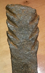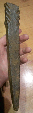 Voici une sorte de pieu sorti d'un labour dans le 54, ça fait 26 cm, c'est assez lourd et il y a comme des décorations des deux cotés en haut. La section est rectangle.C'est le deuxième que je trouve en peu de temps.