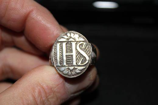 c'est une bague au monogramme du Christ , tu trouvera des explications IHS sur Wikipédia.