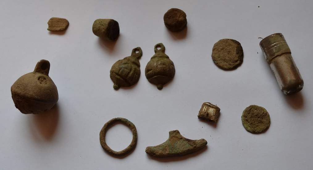 [1885] La sortie d'hier matin avec un tout petit dé, une pomme de ceinture, un grelot, un morceau de boucle ??, 2 savos, une bague d'oiseau.