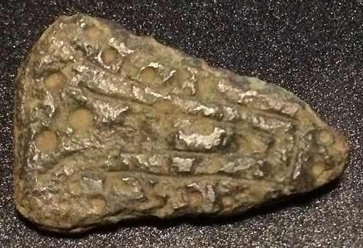 J'ai trouvé dans un labour ce petit morceau de bronze en forme de triangle avec des ornements dessus.