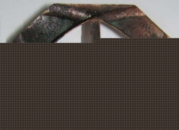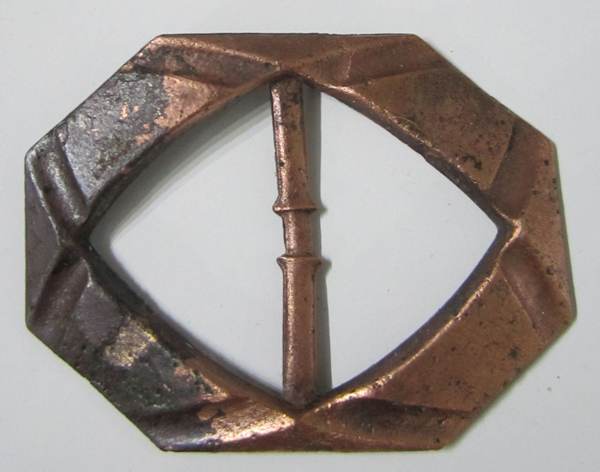 Voici une boucle en métal cuivreux de forme octogonale allongée pour une petite identification et datation si possible.