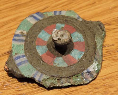 j aurai besoin de confirmation , pour la simple raison que l émail apparaît aussi lisse et brillant que du verre,,, les restes d attache au revers par contre , me font pencher du coté des fibules,,,,
