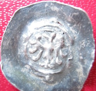 Je pense qu'il s'agit d'un denier (pfennig) anépigraphique à l'aigle héraldique, ailes éployées, emblème de la dynastie des empereurs Hohenstaufen frappe pour le compte de l'évêché de Strasbourg. Atelier monétaire d'Offenbourg