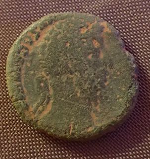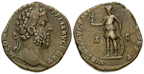 La légende du revers est une dédicace ''à la vertu de l'auguste Commode, grand pontife, investi pour la douzième fois de la puissance tribunitienne, acclamé huit fois empereur par ses troupes, cinq fois consul et Père de la Patrie''.