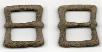 C'est peut être un passant ou un passe guide plutôt qu'une boucle. Pas de trace d'ardillon sur les cadres ni, sur la traverse centrale, de trace de porte ardillon. Il pourrait être très ancien car on le dirait coulé, il ne semble pas y avoir de traces de brasure.