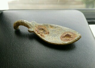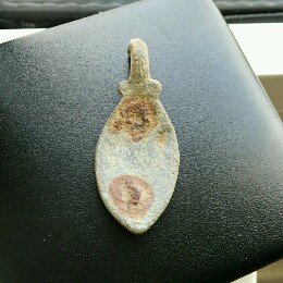 Voici un petit objet curieux a identifié, une sorte de bronze étamé qui mesure 4 cm par 1,5cm.