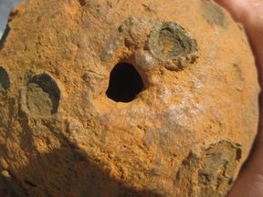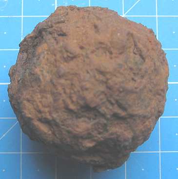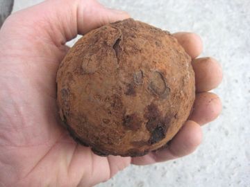 Trouvé dans les labours cette boule en fer bien abimée D= 4 cm environ. Poids 200gr. Quelqu'un a t' il une idée, merci