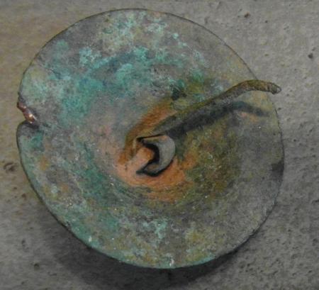 Pour moi, il ne s'agit pas d'un bouton de l'Age du Bronze, car l'attache à l'intérieur est constitué d'un grand arc, reliant les deux côtés, ce qui n'est pas le cas ici. Difficile de bien comprendre, il nous faudrait une description plus complète ! Il semble en effet, que cette tige pivote au fond ! Et pour une fibule, cette tige ne peu pas se présenter sur une base alignée à son point de départ, donc non aussi ! Je partirai plus pour une déco....