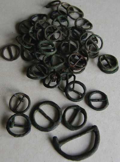 La boucle un peu plus grande, juste à droite de celles possédant encore leurs ardillons ne présenterait-elle pas un face plate (section du 'fil' demi-circulaire) ou peut-être d'autres ?