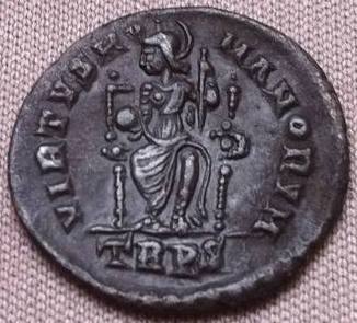 semble être une silique au revers Rome casquée et drapée assise à gauche sur un trône, tenant un globe nicéphore de la main droite et un sceptre de la main gauche