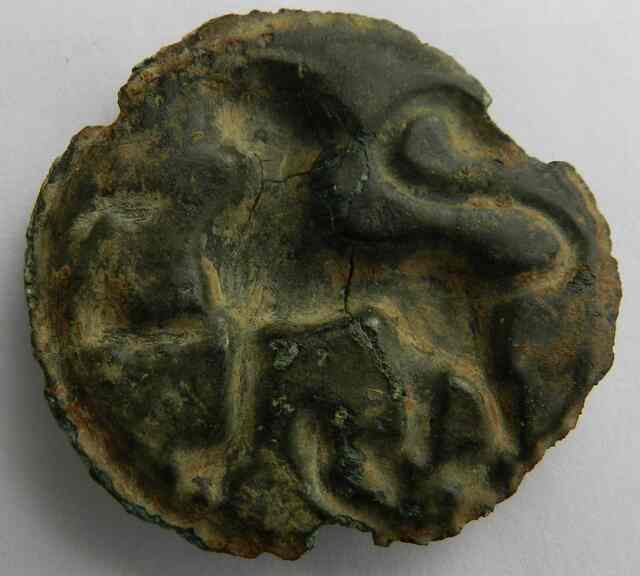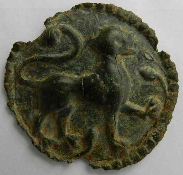 boite à sceau circulaire rivetée, d'époque romaine, à décor zoomorphe. La cassure franche, en haut à gauche en R0 indique vraisemblablement l'endroit du rivet cassé.
