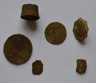 Un bague à coudre, une savonnette, un morceau de DT, un bouton, la grosse monnaie est un décime mais pas en bon état.