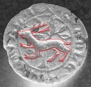 Bien vu Vincent! Au microscope on distingue clairement un animal à 4 pattes avec des bois sur la tête. Donc sûrement un cerf! Par contre les inscriptions sur le côté sont illisibles...