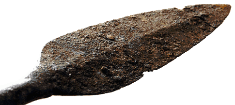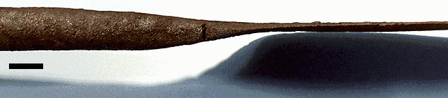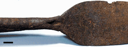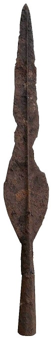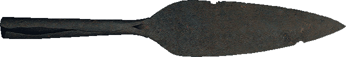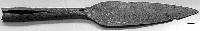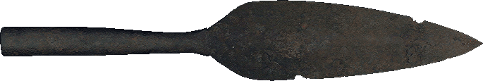 -> La pointe possède une largeur maximale de 4,5 cm, le fer est fin et présente (sur une face seulement) une nervure centrale très peu proéminente (non visible sur les numérisations ci-dessous).
