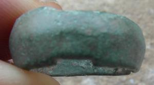 Oui, j'avais pensé à ça aussi, comme si une décoration était fixée à cet endroit, qui est quasi le plus large. D'ailleurs, si elle avait été portée en pendentif, c'est le côté le plus fin qui aurait été usé.