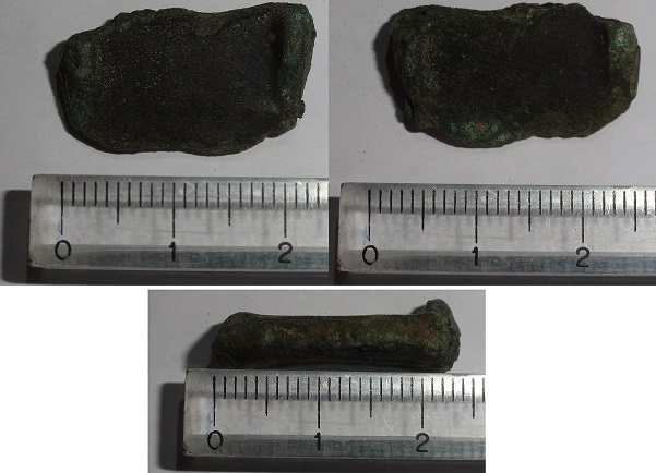 Du coup petite sortie venteuse cet après midi sans grand résultat hormis ce pitit bout de bronze qui me pose problème: pour moi ça ressemble à un morceau de talon de hache en bronze?
