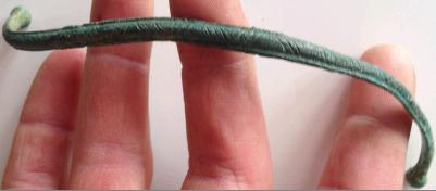 J'ai trouvé cet objet en surface dans un champ du Doubs. J'ai d'abord cru à un fil de cuivre patiné mais en regardant de plus près, j'ai vu des groupes de 3 traits dans un sens et dans l'autre avec à chaque extrémité 2 boules. La patine est superbe. Je pense à un torque ou un bracelet d'enfant. L'objet a été plié à force d'être retourné par la charrue. Il mesure environ 20cm de long. Pouvez vous me dire s'il s'agit bien d'un bracelet ou torque gaulois?