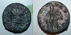 Monnaie romaine trouvée ce jour. Je pensais à un AS HADRIANUS, mais je ne trouve pas la colonne qui semble être devant le personnage debout. Merci encore pour votre aide et vos suggestions pour cette identification.