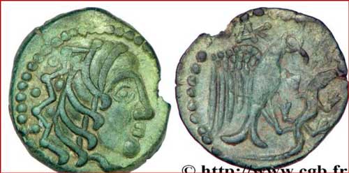 Je n'y connais pas grand chose non plus, mais en cherchant les bronze à l'oiseau et au lézard, tous deux bien visibles sur ta monnaie, je tombe sur un bronze des carnutes donné pour -52. La principale différence avec ton exemplaire réside dans la chevelure.