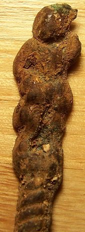 Voilà, elle a été trouvée dans l'Aube (10), elle mesure 11cm. env. x 4cm. de large, le revers est plat et il y a un bonhomme au bout du manche