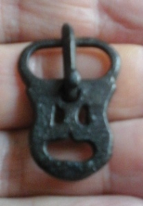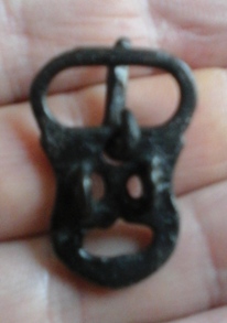 [1757] Bonjour à tous, magnifique boucle en bronze avec son ardillon et une superbe patine noir, 30mm par 21mm. Trouvé en contexte médiéval dans un éboulis. Je pense qu'il s'agit d'une boucle de chausse mérovingienne. Pouvez m'apporter vos lumières pour une datation svp ? Merci pour tout.