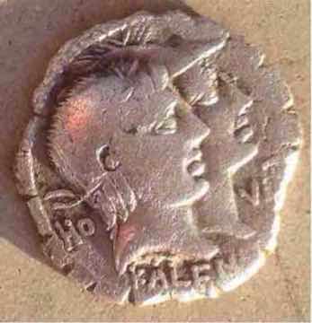 Q. Fufius Calenus et Mucius Cordus. Serratus 70 av. J.-C. 4,06g. Têtes accolées de l’Honneur, laurée, et de la Vertu, casquée, à droite; dans le champ gauche HO; dans le champ droit, monogramme VIRT; à l’exergue, KALENI / L’Italie et Rome se serrant la main; entre elles, une corne d’abondance; à gauche, un caducée ailé et le monogramme ITA; à droite, RO; à l’exergue, CORDI. Cr. 403/1a; B. (Fufia) 1; Syd. 797.