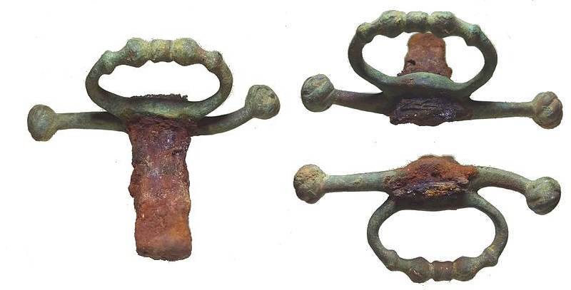 lors de sa sortie en terre une lame en fer d'environ 30 cm était présente mais à malheureusement casser en 2 quand je l'ai prise dans la main
