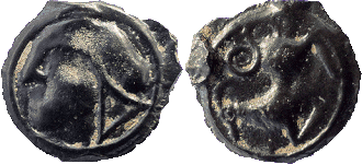 D'un côté il représente une tête stylisée assez grossière, et de l'autre un animal ressemblant à un bouquetin. Il est intéressant de noter le décalage d'environ 90° de la frappe entre l'avers et le revers.