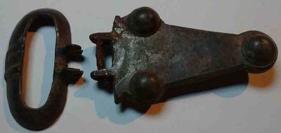 Je vous soumets cette plaque boucle(sans ardillon rrrrrrrrh!),trouvée dans Le Lot pour obtenir une datation.Elle ne parait pas si ancienne,pas de gravures,pas de fioritures à la base des bossettes,pas ou peu d'usures sur les tranches.Le champ de la plaque parait être en bronze étamé,reste de charnière ferreuse,pour un poids de 48 grammes,longueur 10cm pour 4,5 de largeur au max,merci pour suggestions;