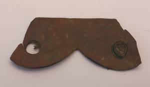 Le mĂ©tal est oxydĂ© de couleure rouge/brun et possĂšde deux trous dont un Ă  encore un rivet. et cet obet est repliĂ© sur lui mĂȘme.