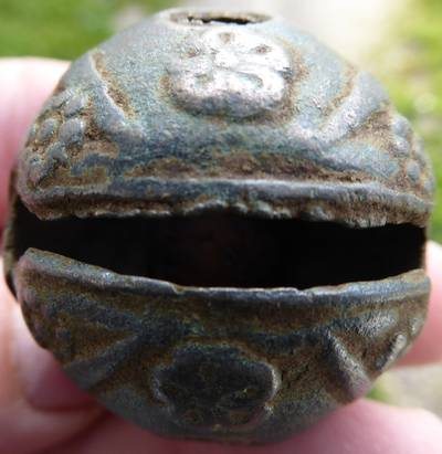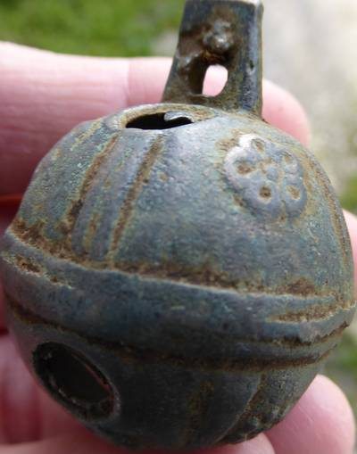 Très jolie trouvaille ! C'est un grelot datant entre XII et XVII ième siècle si je me trompe pas ! Très beau grelot décoré en tout cas :)