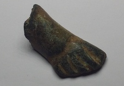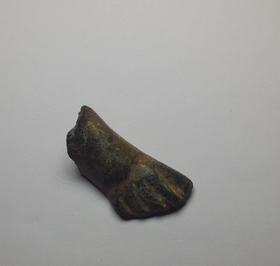 Je vous soumets ce petit en bronze de 9,4 grammes(25mm/15mm),trouvé sur un point haut,dans le Lot.C'est creux,je m'interroge donc sur l'utilité de cet objet et demande confirmation pour la période.Je doute fort que cela soit le pied d'une statuette.