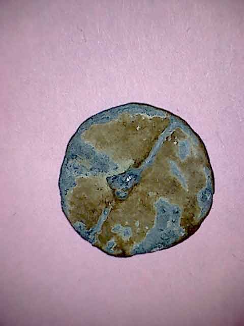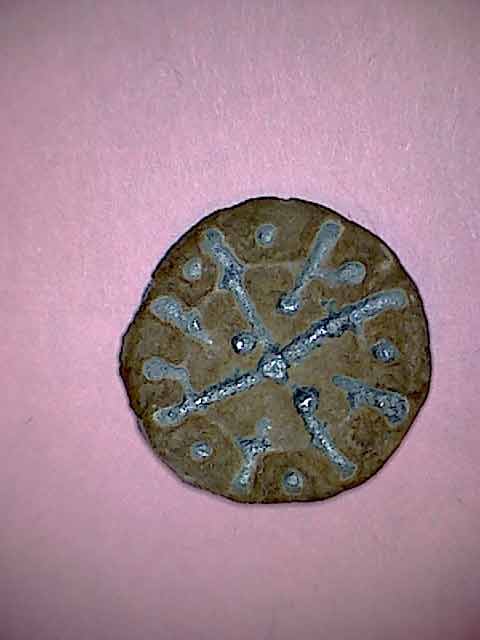 Je confirme l'identification de Toc et ajouterai simplement que ce type de bouton monétiforme (médiéval voire renaissance) est souvent confondu avec des méreaux (de plomb)...