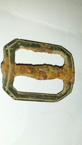 C'est une boucle de chaussure dont le cadre est en laiton ou en bronze, mais dont le pont (goupille) est en fer, ainsi sans doute que l'ardillon et la chape d'accroche qui ont disparu.