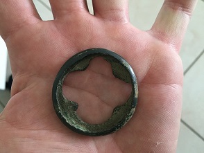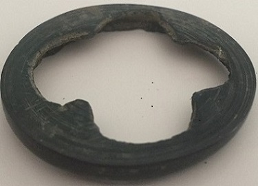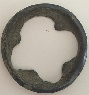 [844] Là il est clair que ce n'est pas un demi-ceint, on voit bien que le milieu est cassé donc je rejoint l'idée du couvercle avec une attache central qui aurait cassée et fait ce trou.
