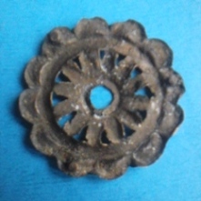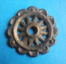 [1757] Bonjour à tous, allez encore un objet en tôle de cuivre ou bronze embouti qui me fait penser à une rosasse gothique, 3 points de fixation triangulaire à l'arrière et un diamètre de 35 mm.