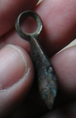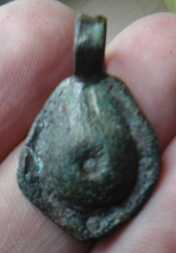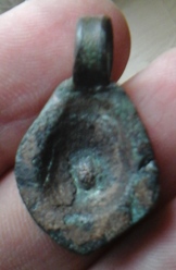 Tout droit sorti de ma BAM, cet objet en bronze avec une forte bélière, 32 mm de long pour 20 mm de large.