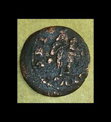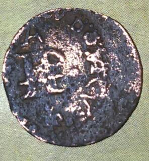 Voici une monnaie en cuivre trouvée il y a quelques années maintenant. Je n'ai toujours pas réussi à l'identifier. Elle pèse 0,82 grand pour 1,5cm de diamètre. Elle est en cuivre. À l'aversion j'y vois un personnage debout avec un bout de titulature NVS dessous. Au revers un symbole au centre qui ressemblerait à un HP lié surmonté d'un A. La titulature je vois DO et de nouveau CVS.