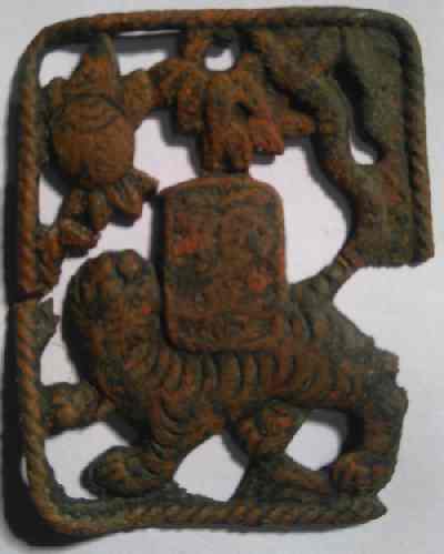 je viens de trouver un bouton dans le meme labour qui ressemble fortement a' l'applique' ci dessus ce qui confirme ce que dit Vincent plutot 19 ;20 eme, par contre si vous pouvez m'aider a trouver a quoi correspond cet ensemble ça serait