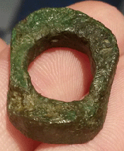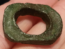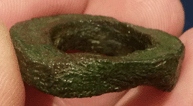 Voici un curieux objet dont la forme et la patine laissent à penser qu'il n'est pas tout jeune. 2,5x2 cm.