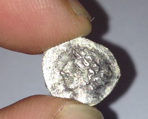 Belle trouvaille en effet ! Surement une obole de Marseille en argent, obole à la tête juvénile tournée à gauche, tête aux traits stylisés représentant peut être le dieu du fleuve Lacydon. Au revers, M-A dans les cantons trois et quatre d'une roue à quatre rayons. Datation possible, 121 à 82 avant J-C.