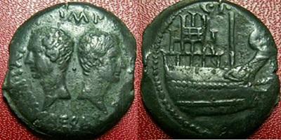 J'ai lu que ce dupondius a été inspiré de l'As de Nîmes et comme ce dernier il a subi aussi les coups de burin pour le diviser en 2.