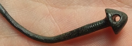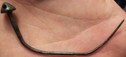 je vous présente un petit objet fortuité il y a quelques temps en forêt, en Haute-Savoie, certainement datant de l'âge du bronze. J'ai du mal à faire la différence entre une épingle et une aiguille (peut-être en rapport avec le trou?), si vous pouvez m'éclairer à ce sujet, et également concernant sa datation et sa typologie (rien que ça!) Elle mesure 7,5 cm de long et pèse 3,80 gr.